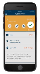 Upon receiving notification of the Worker’s arrival and connecting in-person at the job site, the Requester will tap the “Confirm” start button. The gig has now started!