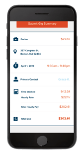 Both the Worker and the Requester have the ability to end the gig at any time by tapping the “End Gig” button. Upon completion of the gig, the Worker and the Requester can view the “Gig Summary” showing total time worked and money earned.