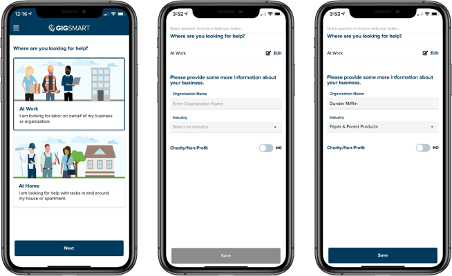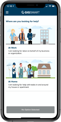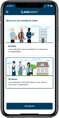 GigSmart’s Get Workers app connects you to workers anywhere in the U.S. so you can fill your unique hiring needs on a per-Gig basis. In order to better tailor the experience to your needs and ensure you get matched with the right workers, we’re asking: where are you looking for help — at home or at work?