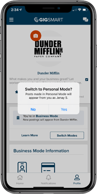 If you’re in Business Mode, your home screen and profile screens make it easy for you to see your current mode and switch to Personal Mode. Simply select Switch Modes. Doing so makes it easy to keep your Business Gigs and your Personal Gigs and payments separate.